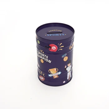 Customized Logo Round Tinplate Oil Drum Piggy Bank Blue Craft Use with Stickers Manufacture Product